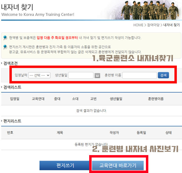 육군훈련소 내자녀찾기 서비스는 복잡한 회원가입과 로그인 과정은 없이도 훈련병 이름, 생년월일, 입대일 날짜 입력의 간단한 조회만으로 찾을 수가 있는데 참고로 현역병 및 보충역은 입영 다음 주 화요일 정오부터 내자녀찾기 검색이 가능하고 그 이전에는 확인이 되지 않습니다.
